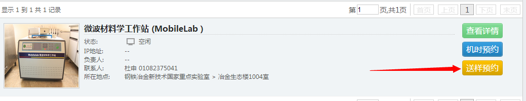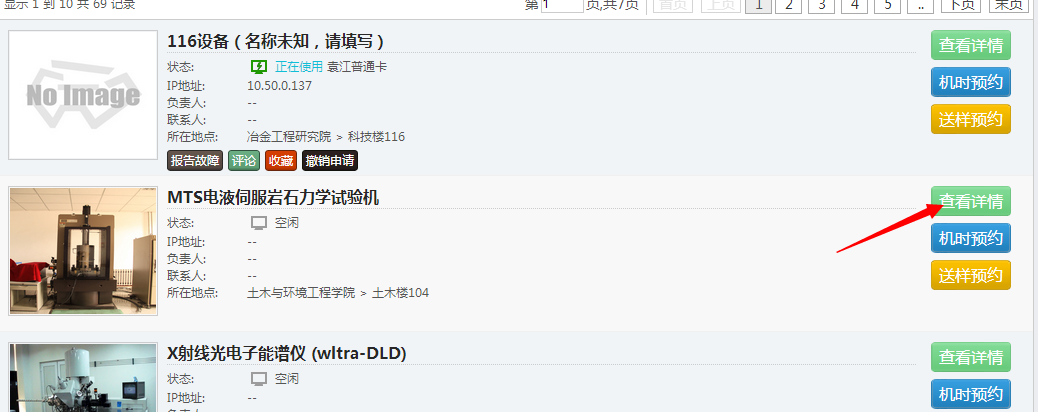 查找到仪器后,可以通过“查看详情”按钮查看仪器相关的详细信息,点击“预约机时”按钮便可进行仪器预约操作。