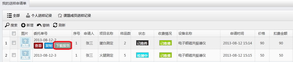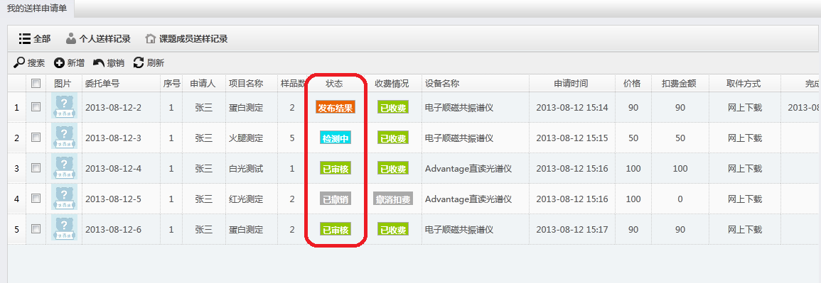 通过“个人中心”→“送样预约管理” →“我的送样申请单”查询样品状态