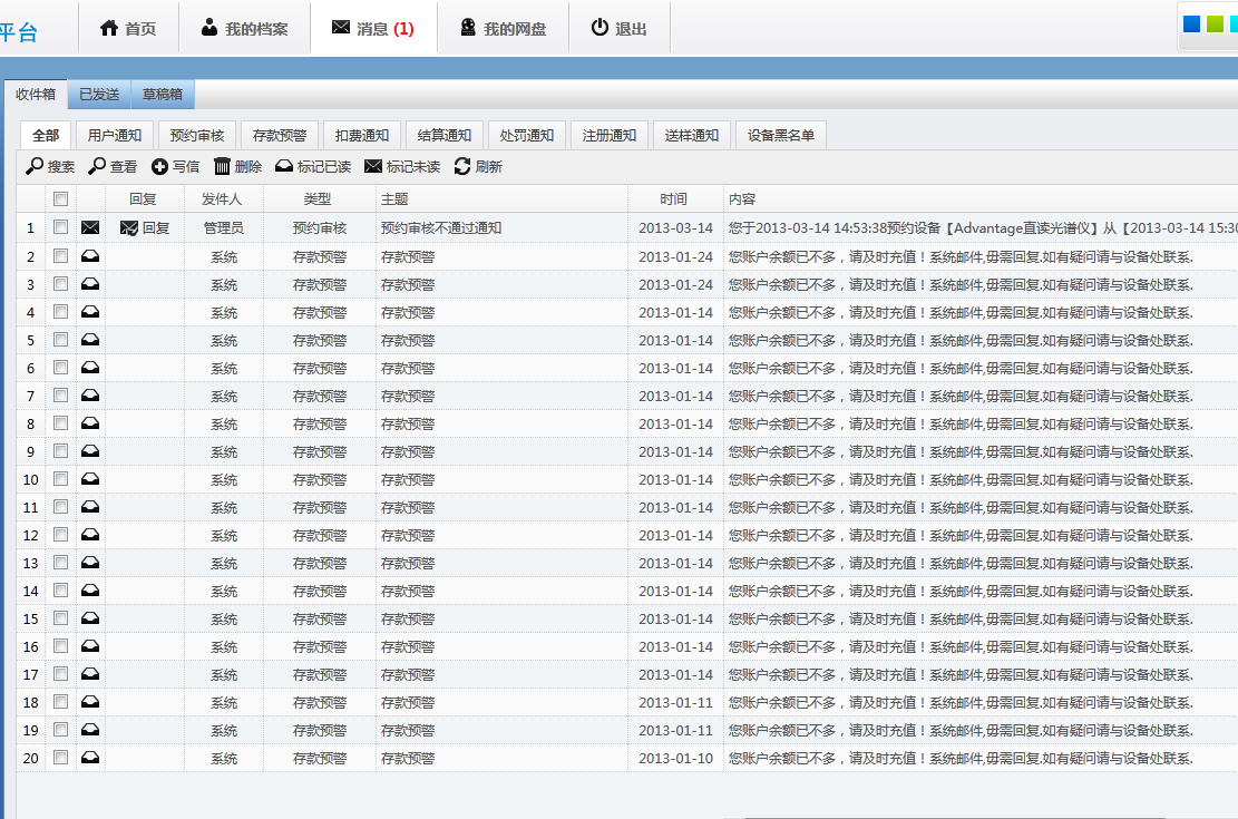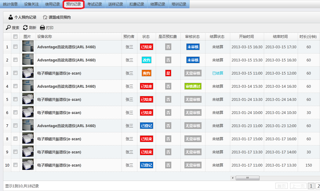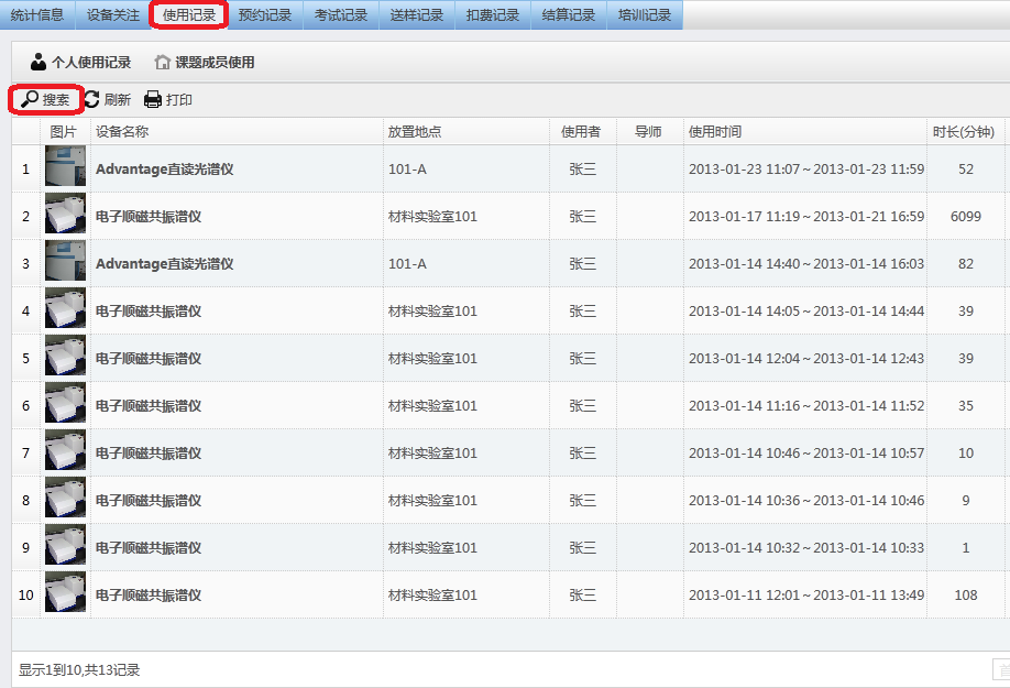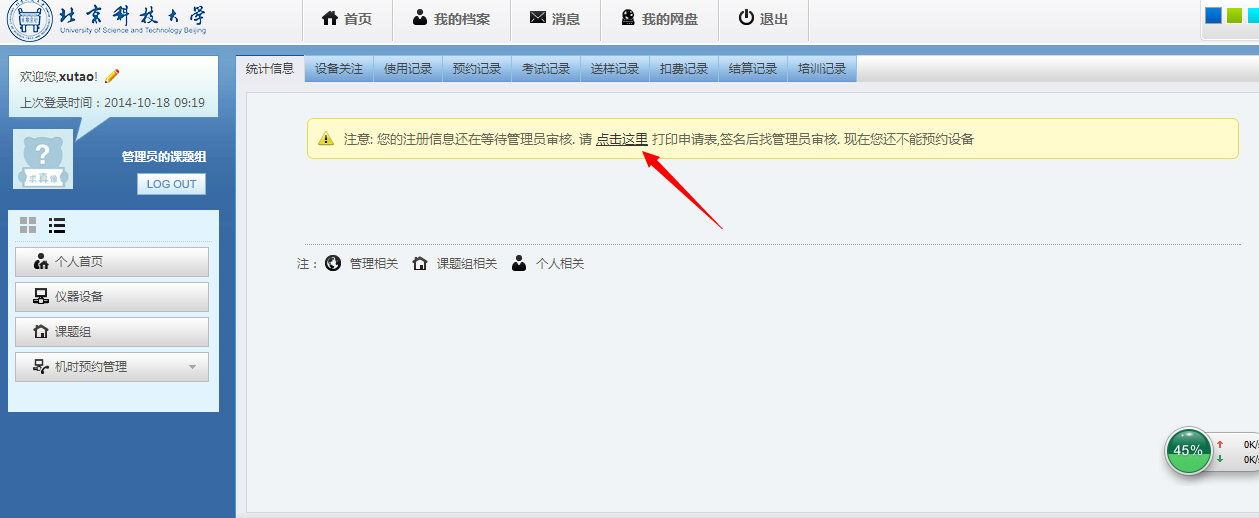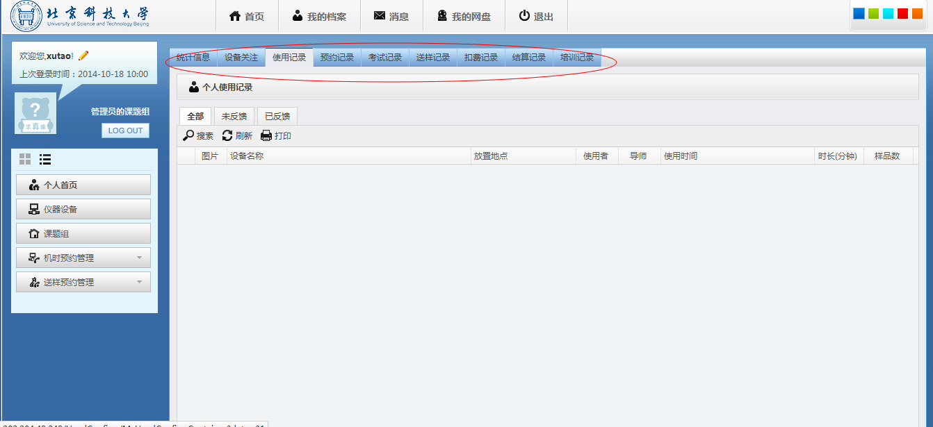用户登入系统后,通过“个人中心”的“个人首页”能查看搜索用户刷卡的“使用记录”、“预约记录”、“考试记录”、“送样记录”、“扣费记录”、“培训记录”等信息。备注:身份为导师的用户,除了能看到自己的使用记录外,能查看所有课题组成员的相关记录,而身份为学生的用户,只能查看自己个人的相关记录。