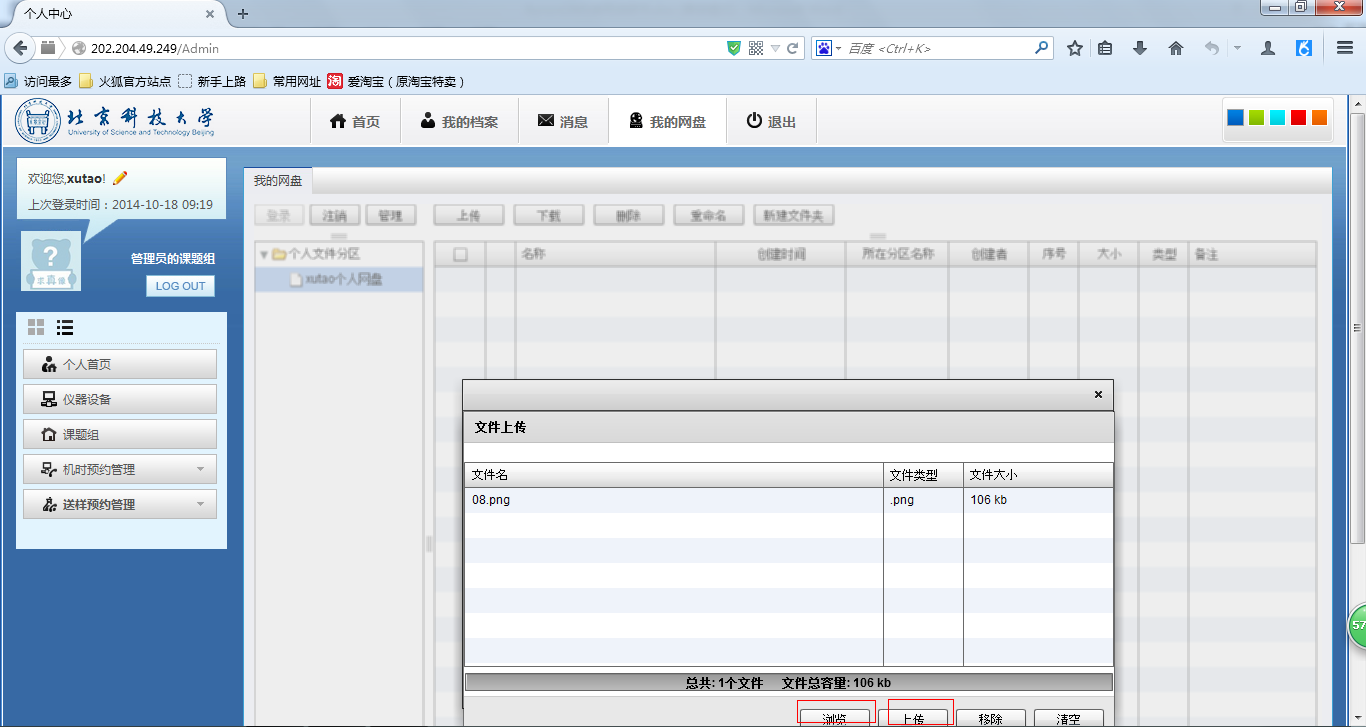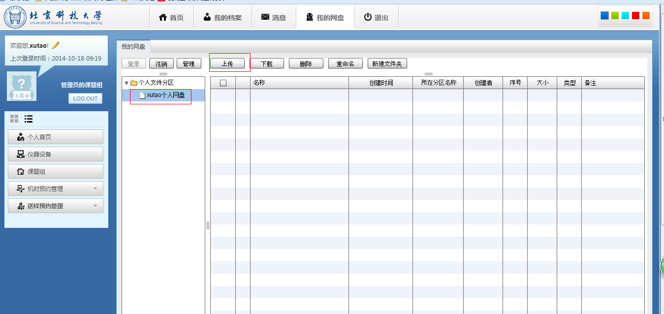 Ø 选中“个人文件分区”下的个人网盘,点“上传按钮”,上传文件(下图)。