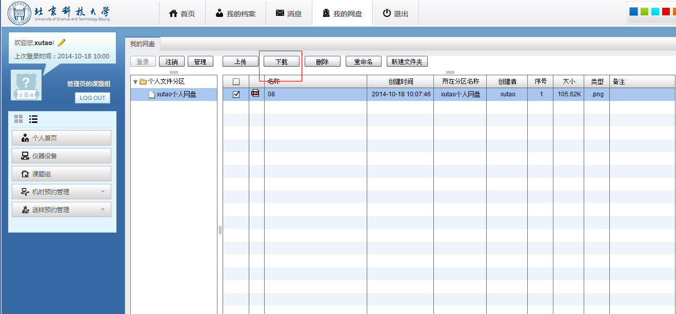 打开个人文件分区,选中需要下载或者删除的文件,点击“下载”或“删除”按钮,便可下载或删除网盘中的文件(下图)