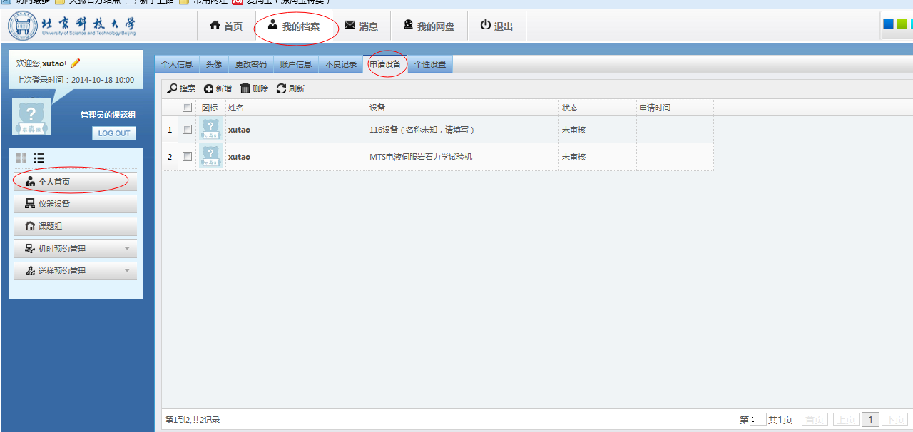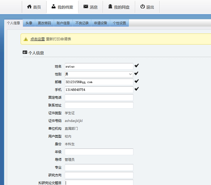 A)点击“个人中心”的“我的档案”,可以对用户自身信息进行查看或编辑:个人信息、头像、密码、账户信息、不良记录、申请仪器及个性化设置,如下图。