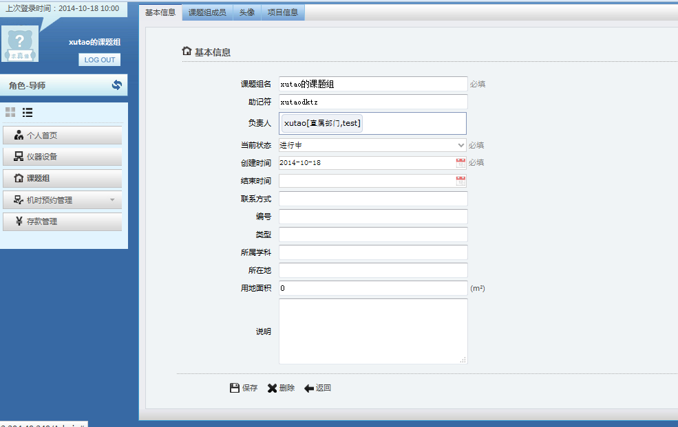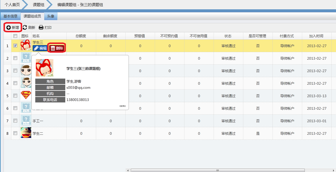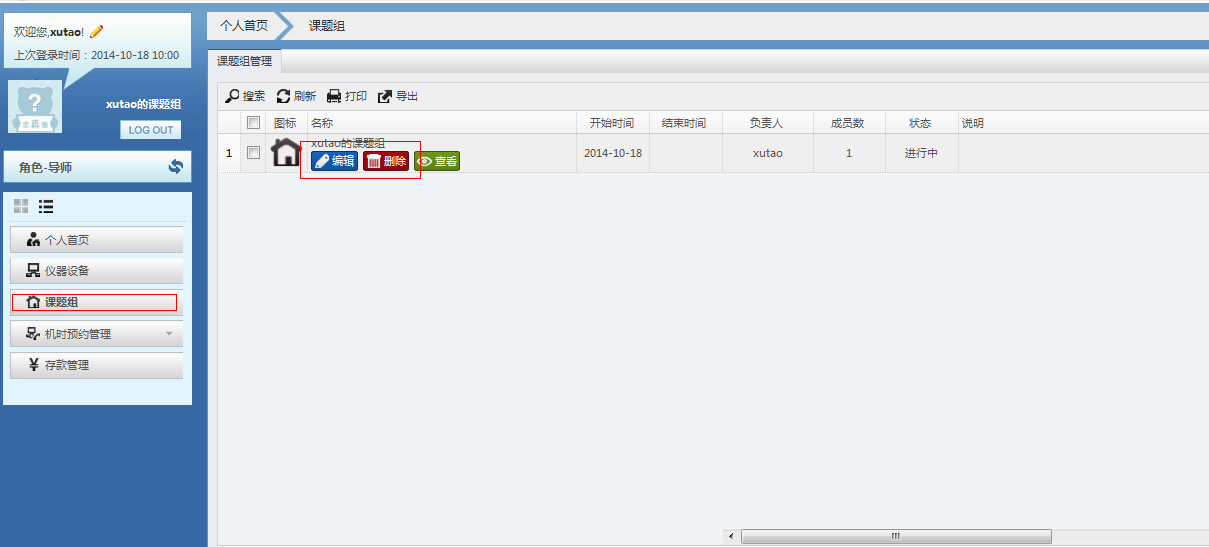 身份为导师的用户,通过可以通过课题管理进行添加课题、对课题相关信息进行编辑、添加或删除课题组成员、给课题组成员分配信用额度。