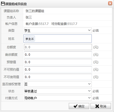 Ø 点击上图的“编辑”按钮,可对课题组成员信用额度进行编辑,如下图。