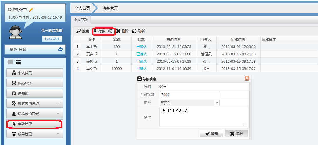 身份为导师的用户,可以通过“个人中心”中的“存款管理”,查看存款记录,并进行存款操作,如下图: