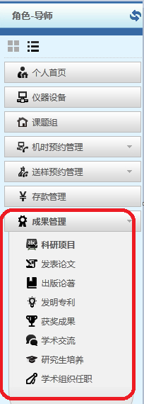 导师,通过“个人中心”中的“成果管理”,对已获得的相关成果进行汇总,如科研项目、发表论文、出版论著等等,如下图。