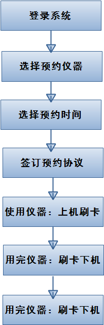 用户审核通过后可以登入系统进行相关仪器的预约操作,具体仪器预约步骤如下图所示: