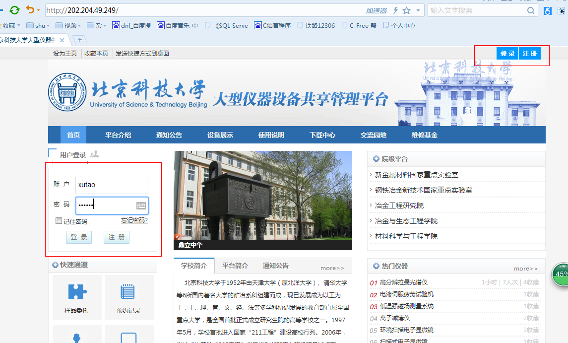 用户在IE浏览器输入大型仪器共享平台的网址,点击网站的右上方的“登录”按钮,输入用户名及密码,点击“登入”,如下图: