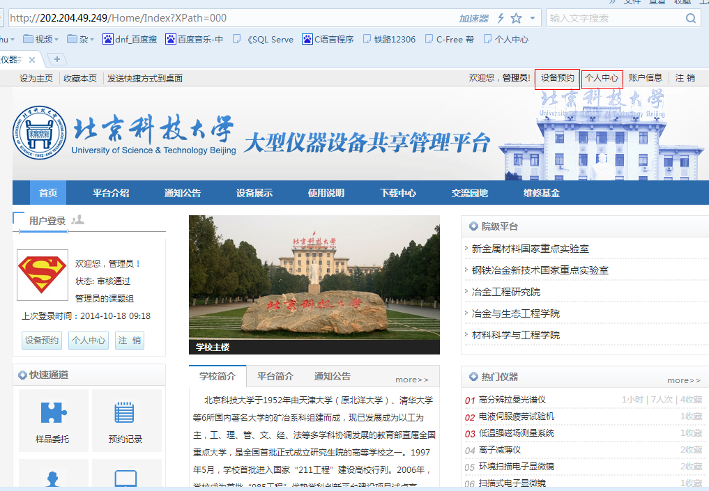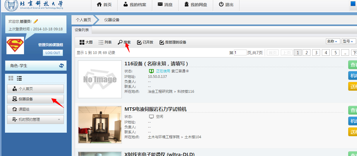 Ø 点击“个人中心”中的“仪器设备”查找仪器,如下图。