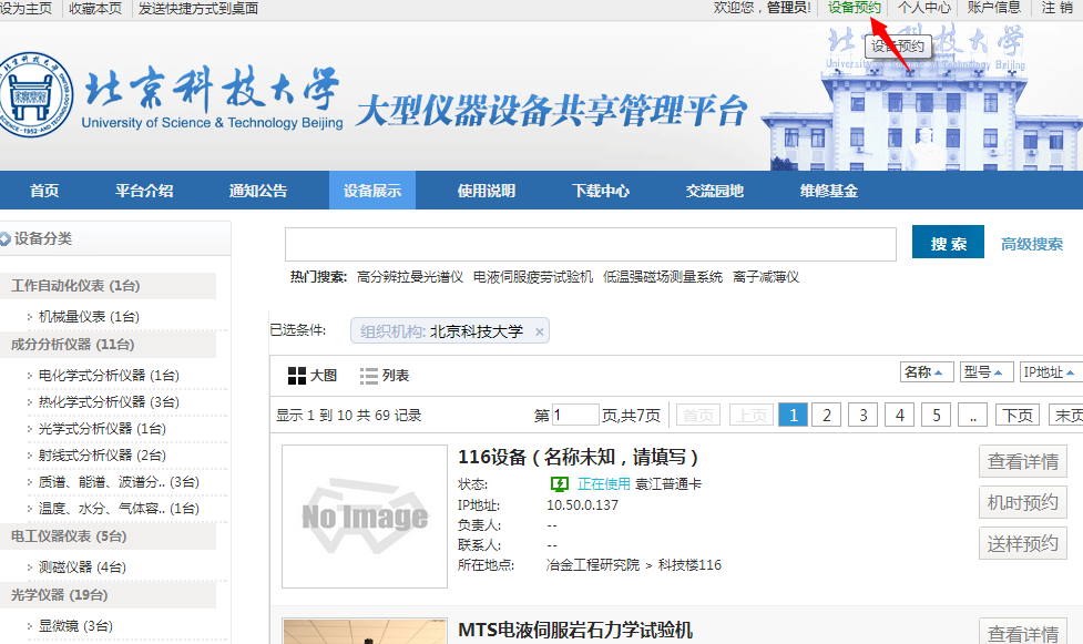 Ø 点击“设备预约”查找仪器,如下图。